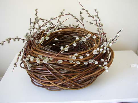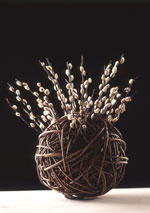 After 15 years of growing willow and experimenting with all the different woods, she feels that the emotional core of her work stems partly from her deep sense of ease with her materials. The common names of her wil-lows read like the colours of a rainbow, and colour is the reason she chooses to grows so many varieties. A brochure accompanying her work includes a list of the willow varieties - 'a bit like a poem':